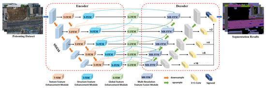 Inspired by the encoder–decoder architecture constructed by U-Net [56], i.e., the encoder extracts multi-scale feature information from the input image, the decoder restores feature map resolution, and skip connections are used for feature transfer between encoder and decoder. By using the encoder–decoder architecture, valuable feature information can be extracted and fused layer-by-layer to improve semantic segmentation accuracy. Similarly, the proposed robust invariant feature enhancement network (RIFENet) uses the encoder–decoder as basic framework and integrates texture feature enhancement module (T-FEM), structural feature enhancement module (S-FEM), global feature enhancement module (G-FEM), and multi-resolution feature fusion module (MR-FFM) for resisting poisoning attacks and improving semantic segmentation accuracy. As shown in Figure 2, in the encoder structure, we use VGG16 as the backbone network to extract multi-scale feature information of aerial images. Then, the constructed T-FEM and S-FEM are used to enhance the texture and structure features of each layer output feature of the backbone network to improve the robust feature information representation and suppress the hidden triggers in the poisoning samples. For the decoder structure, we introduce the MR-FFM for fine-grained fusion of different scale feature maps, restore the original size of feature map resolution, and retain the detailed feature information contained in the aerial image. Between the encoder and decoder, we use the G-FEM to perform global correlation modeling and interaction of different features to enhance the perception of pixel position information and improve the semantic segmentation model robustness to poisoning attacks. In addition, to improve the model training process robustness and accelerate convergence, we use the deep supervision strategy for the decoder structure, i.e., add convolution and sigmoid function to calculate the loss of each layer in the decoder.
