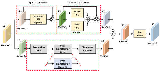 where denotes 1 × 1 convolution, indicates the batch normalization function, is the nonlinear activation function. and denote average pooling and max pooling operations on the feature map channel dimension. and represent the output feature maps of spatial attention and channel attention, respectively. For feature map , Swin Transformer is used to establish the global correlation of texture features, which can be defined as follows.