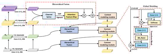 where denotes the floor function. After hierarchical feature fusion, G-FEM uses the context modeling module to further extract global information and fuse with hierarchical features. The context modeling module consists of global modeling and transform block, as shown in Figure 5. For the global modeling part, convolution is used to convert the hierarchical feature into the size of , and softmax function is used to obtain the global weight attention feature map that can represent the importance of each pixel position. Then, the global attention feature is multiplied by the input feature reconstructed to size to obtain the context feature information. The calculation of global modeling is defined as follows.