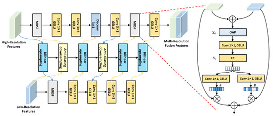 As shown in Figure 6, MR-FFM interacts and fuses low-resolution and high-resolution features of different scales in parallel. In the feature fusion process, MR-FFM maintains the original size of the low-resolution features, reduces the high-resolution features to of the original size to expand the receptive field range, and adaptively aggregates the feature information of different receptive fields by using multi-resolution selection fusion (MRSF) strategy. Formally, given the input feature map as , the feature map X is preprocessed by upsampling and downsampling operations with residual structure to obtain the reconstructed feature maps and . In the sampling process, we use bilinear interpolation upsampling and anti-aliasing downsampling operations, and we use Gaussian error linear units (GELU) as activation functions to prevent feature information loss caused by sampling operations. The specific calculation process is as follows.