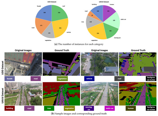 Figure 7. Detailed analysis of the UDD [63] dataset and Semantic Drone [64] dataset. - UAVid Dataset: The dataset uses the 10 m/s stable flying drone DJI-Phantom3 as the data collection device, flying at the altitude of around 50 m and using a camera with 4k resolution for continuous shoot. The original resolution of the collected images is 4096 × 2160 or 3840 × 2160, and each image contains urban objects in different scenes. The dataset provides fine-grained manual annotation information, and the labeled object categories include building, road, tree, vegetation, moving-car, static-car, and human. Because the dataset is mainly collected in the urban center region, the image scene is more complex. The number of instances for each category and some sample images are shown in Figure 7. For the semantic segmentation task, the dataset provides 300 high-resolution aerial images. We use 210 images as training set, 30 images as validation set, and the remaining 60 images as testing set. In addition, we scale the original image size to 2048 × 1024 to reduce the computational burden of hardware devices and accelerate model training.