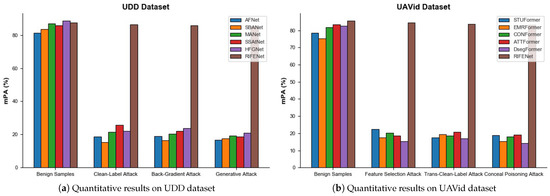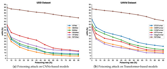 In this section, we first verify the impact of setting different poisoning rates on the model performance, and then systematically evaluate and discuss the vulnerability of existing aerial image semantic segmentation models to poisoning attacks. To analyze the impact of the poisoning rate on the model performance, we use clean-label attack [35] to generate poisoning samples on the UDD dataset and feature selection attack [66] to generate poisoning samples on the UAVid dataset. In the experiment process, the poisoning rate takes the value from . The semantic segmentation accuracy of CNNs-based and Transformer-based aerial image semantic segmentation models on the poisoning sample dataset with different poisoning rates is shown in Figure 12. It can be seen that as the poisoning rate increases, the mPA values of all compared semantic segmentation models gradually decrease, indicating that setting the higher poisoning rate can effectively destroy model performance and reduce semantic segmentation accuracy. However, compared with the existing semantic segmentation models, the proposed RIFENet achieved the best performance. For instance, on the UDD dataset, the poisoning rate is set as 90%, all the compared methods obtained an mPA value of only 15%, while the proposed RIFENet obtains over 70%, indicating the effectiveness of the proposed method in defending against poisoning attacks, and further demonstrating that robust feature enhancement can significantly improve the generalization capability of the model against poisoning attacks.