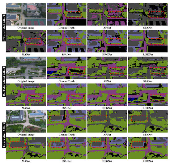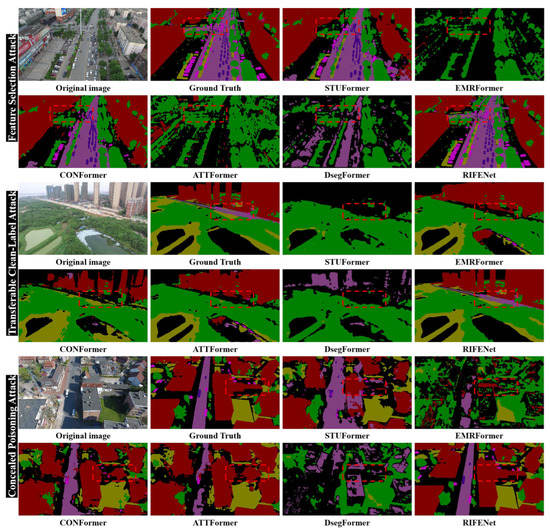 To demonstrate the advantages of the proposed method in defending against poisoning attacks and completing accurate semantic segmentation, we compare the proposed method with several state-of-the-art methods, including the CNNs-based methods and the Transformer-based methods. For the CNNs-based methods, the proposed RIFENet is compared with AFNet [69], SBANet [70], MANet [71], SSAtNet [72], and HFGNet [25]. For the Transformer-based methods, RIFENet is compared with STUFormer [73], EMRFormer [74], CONFormer [75], ATTFormer [76], and DSegFormer [77]. For the generation of poisoning samples, as described in Section 4.2, we conduct clean-label attack [35], back-gradient attack [38], and generative attack [65] on the UDD dataset and perform feature selection attack [66], transferable clean-label attack [67], and concealed poisoning attack [68] on the UAVid dataset. The details of different compared methods are as follows.