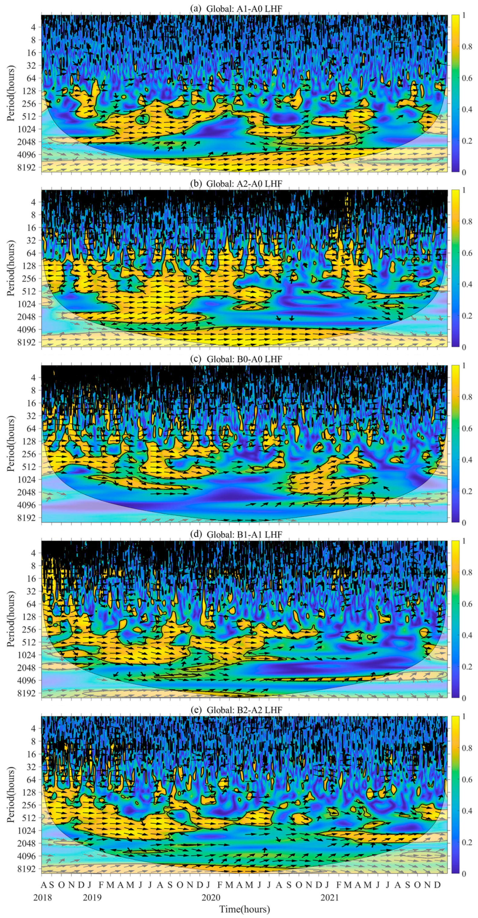 3.4. Wavelet Coherence Analysis of the Hourly Heat Fluxes