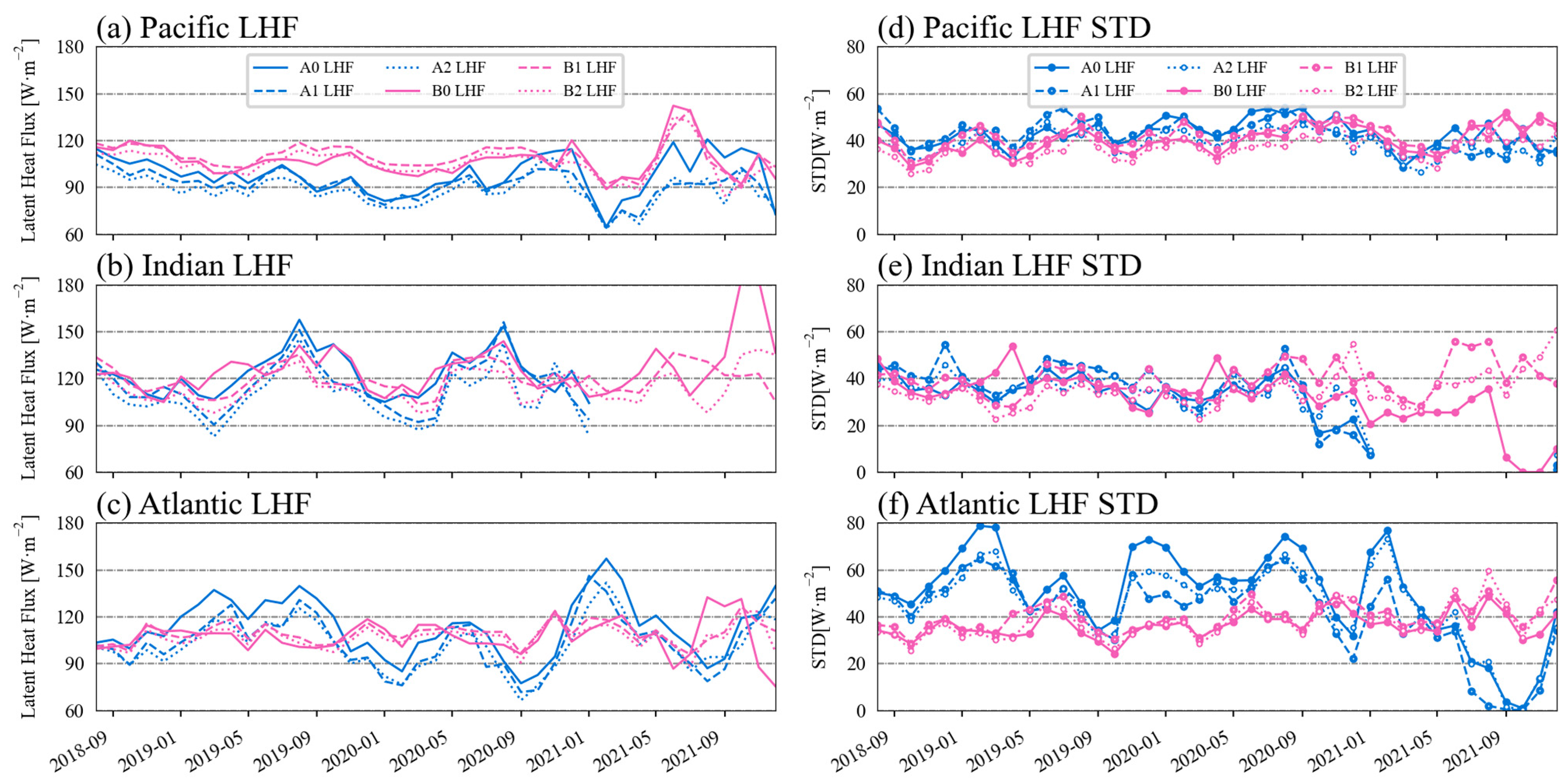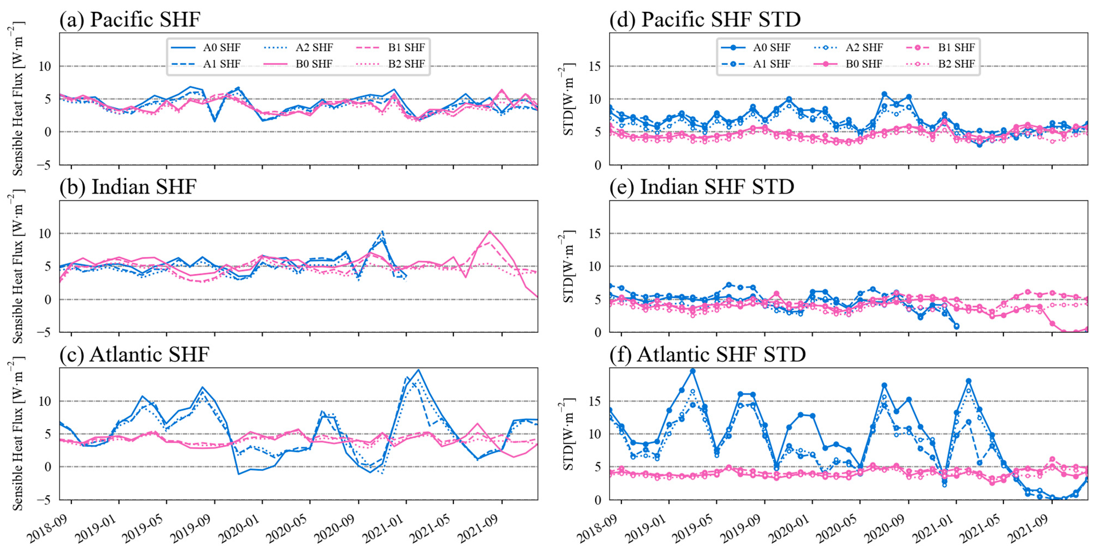 - The monthly LHF and SHF time series in the Pacific and Indian Oceans were generally consistent with each other. However, significant differences were found in the Atlantic Ocean, which may be attributed to the differences in the input SST, rather than the input wind speed.
