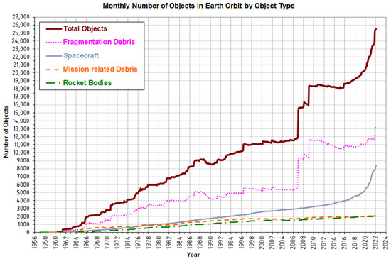 With the continuous development of science and technology, the exploration of the space environment is gradually deepening. Satellites are widely used as infrastructure for modern communications, navigation, surveillance, and reconnaissance. Therefore, the number of satellites in space has increased dramatically, and a large quantity of space debris and abandoned satellites have posed a serious threat to the security and stability of the space environment. Figure 1 shows the growth curve of space debris quantities over time and the total mass of all space objects in Earth orbit statistically exceeding 10,400 tons [1]. Therefore, the space object monitoring system has gradually become a hot direction in many countries. The application of traditional telescopes in accurate positioning and continuous tracking of natural celestial bodies such as stars and planets has been very mature [2], but the movement of near-earth space objects such as artificial satellites, debris, and meteorites are different from natural celestial bodies, which makes the traditional space monitoring system unable to achieve effective performance. Currently, as an important information source of space situational awareness, image sensor provides a solid data foundation for space-based optical detection. It has intuitive, all-weather, and all-directional advantages, such as ORS-5 and SBSS-1 of the United States. Therefore, space-based optical detection system has been widely used in monitoring abandoned satellite debris, space threat object warning, space collision avoidance, satellite integrity monitoring, space debris warning, and so on.