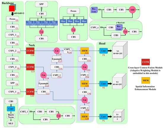 Considering the simplicity and high efficiency, we adopt the YOLOv5 framework as a baseline. Yolov5 is mainly composed of input, backbone, neck, and head. This method first enhances the image at the input terminal and subsequently extracts feature maps of different scales from the backbone through structures such as focus and CSPDarknet. These feature maps are then fused in the neck, ensuring that each scale’s feature map contains strong semantic and positional information. Finally, the feature maps are sent to the head for prediction. The CS-YOLOv5 we proposed mainly improves its neck and data enhancement parts; the overall framework is shown in Figure 3.