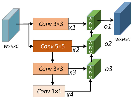 where x1 and o2 represent the feature map obtained by the first branch and the second branch, respectively; Convn×n(∙) represents the convolution operation; n × n represents the size of the convolution kernel; AWM [∙] represents that the adaptive weighting module processes the feature map.