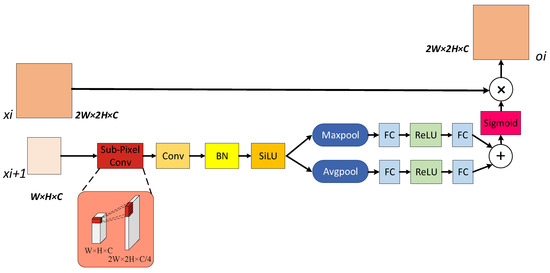 Aiming to address the issue of feature dilution caused by multiple upsampling during the feature fusion process and the impact of redundant information generated during the fusion process on the detection accuracy, we propose an adaptive weighting module, which can assist the network in effectively detecting dense and small objects. The structure of the AWM, as shown in Figure 5, combines the attention mechanism with sub-pixel convolution to achieve pixel-wise enhancement of feature maps.