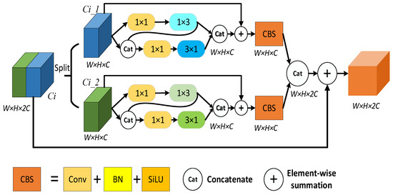 As shown in Figure 6, the SIEM contains two main branches and a skip connection, and each branch contains two branches and a skip connection. The feature maps of three scales (C20, C24, and C28) generated by the top-down pathway feature fusion are sent to the SIEM. The input feature map is equally divided on the channel to obtain feature maps and :