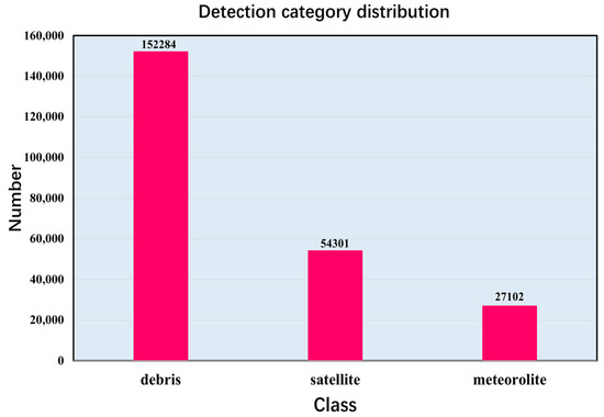 The number distribution of the three categories of objects is shown in Figure 10. The NSO dataset contains 84,742 small objects (area < 1024), 108,610 medium-scale objects (1024 < area < 9216) and 40,335 large objects (area > 9216). The average area ratio of the debris in the image is 0.45%, the satellite is 7.25%, and the meteorolite is 0.46%. The NSO dataset is divided into training, validation, and test sets according to a proportion of 8:1:1.