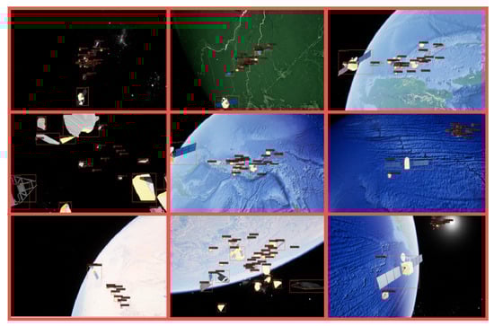 To solve the problem of hard obtaining the real space object dataset, we construct a space target simulation system, which can simulate the images obtained by observing space target objects from different continuously changing perspectives under different angles. The system mainly comprises a perspective motion modeling module, a scene rendering module, and an image post-processing module. The quality of the simulated images produced by this system is very high, which can provide a good data foundation for the research of space-based observation equipment detection, space-based target detection, identification, and analysis technology. We simulated the space environment of three types of objects: debris, satellites, and meteorites, by using the space object simulation system. To obtain data that better meets our requirements, we densely arranged the debris in space and adjusted the distance between the objects and observation points to change the object size. Then, we recorded the simulation process of the object’s flight around the Earth from different observation angles. The farther the object is from the observation point, the smaller its size. To ensure high similarity between adjacent images, we extracted frames from recorded videos at intervals of 0.5 s. The resulting data sample contains 233,687 instances of 3 object categories in 10,574 images with a resolution of 2560 × 1440. Some samples of the NSO dataset are shown in Figure 9. The red frame is a magnified display of the aggregated objects.