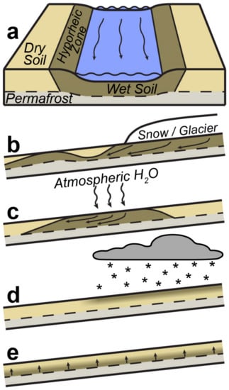Primary sources of soil moisture in the McMurdo Dry Valleys of Antarctica: (a) wetting of the hyporheic zone by nearby overland flow; (b) soil moisture sourced from the melting of uphill snow or glaciers; (c) atmospheric deposition of moisture (deliquescence); (d) direct precipitation; and (e) capillary wicking from melting of buried ground ice.