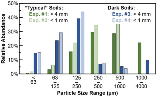 All four of our experimental soil samples can be classified as different varieties of sand, from very coarse sand (Exp. #1) to loamy sand (Exp. #4) (Figure 4 and Table 1). The typical soils were much coarser than the dark soils, with 19.6% of the bulk typical soil sample (Exp. #1) having particle sizes less than 250 µm and 77.8% of the bulk dark soil sample (Exp. #3) having particle sizes less than 250 µm. The relatively large particle sizes associated with the typical soil set results in a relatively gradual transition from sand-, to granule-, to pebble-sized particles. However, the finer nature of the dark soil samples does not preclude the surface from still being dominated by granule- and pebble-sized particles, which can be seen as an enrichment of these larger particles despite the lack of particles between 1 mm and 250 µm in size (Figure 4).