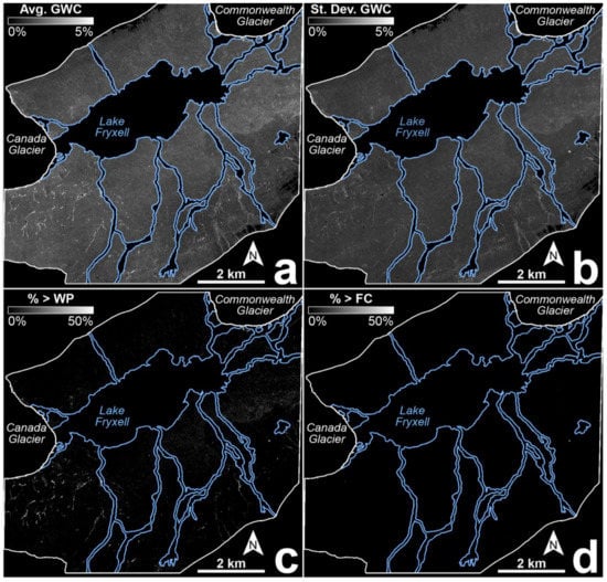 (a) True color image of an area south of Canada Glacier, which is seen at the upper edge of the image; (b) average gravimetric water content (GWC) of the soil in the 21-image composite developed in this study; (c) the fraction of the time each pixel is observed to exceed the estimated wilting point (WP) of 6.1% GWC; and (d) the fraction of the time each pixel is observed to exceed the measured field capacity (FC) of 12.3% GWC. Source imagery © 2009–2021 Maxar.