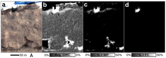 The ability to remotely determine soil moisture over both space and time has been long sought after in the MDVs, where soil conditions can change rapidly over timescales of minutes and where global climate warming is changing the baseline of soil conditions. Most satellites specifically designed to study soil moisture are not well suited for this type and scale of analysis. For example, the ~40 km spatial resolution of the Soil Moisture Active Passive (SMAP) mission is approximately four orders of magnitude greater than the scale of ecosystem processes occurring in the MDVs [18]. Additionally, the penetration depth of C-band radar such as that employed on the RADARSAT-2 mission varies greatly as a function of soil moisture itself, ranging from less than 1 mm depth at ~35% volumetric water content to more than 10 cm at <5% volumetric water content [19]. Therefore, the use of high-resolution visible/near-infrared (VNIR) reflectance spectroscopy and visible imaging has been the most utilized method for studying soil moisture in the MDVs over the last decade. Ref. [20] demonstrated how the flow of water in the shallow subsurface of the MDVs can be identified from orbit and how their flow paths correlate with topographic depressions and poorly channelized surface flow paths, making them predictable using remote sensing data. Then, [21] demonstrated how hyperspectral visible/near-infrared (VNIR) remote sensing data can be used to quantitatively predict GWC using the depth of the 1.4 µm absorption feature associated with OH− stretching vibrations and combination tones of the H2O molecule [22]. Lastly, refs. [23,24] demonstrated a novel technique for confidently detecting regions of enhanced soil moisture by quantifying observed soil darkening while also accounting for variations in surface shadows, illumination, and the underlying geological properties of the surface. These techniques are essential for using remote sensing and spectroscopic data to confidently detect areas of increased soil moisture in the absence of direct field measurements.
