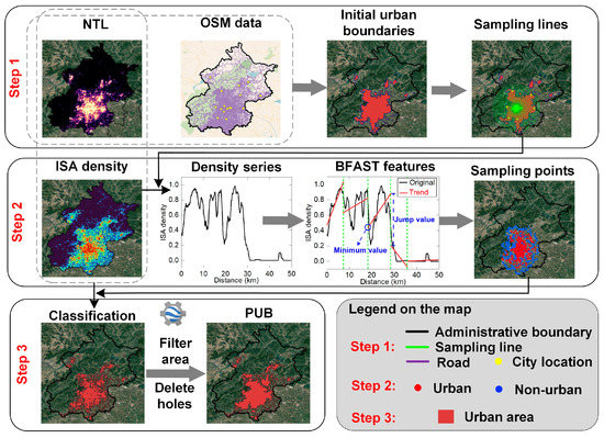 Flowchart of producing CPUB (NTL means the nighttime light data; OSM means OpenStreetMap; ISA means the impervious surface).