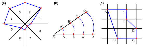 Schematic diagram explaining the scale inconsistency problem caused by directly connecting mutation points for different strategies (black lines: sampling lines; blue lines: mapped boundaries; red dots: detected mutation points). (a) Connection of mutation points obtained by radial lines; (b) connection of mutation points obtained by a fan-shaped area-constrained method; (c) connection of mutation points obtained by a grid.