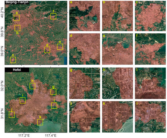 The spatial extent of CPUB urban areas in the Beijing–Tianjin region and Hefei, Anhui Province, in 2020 (Subfigures (a–f) show the local details of the urban-scale boundaries in the Beijing–Tianjin region. Subfigures (g–l) show the local details of the building-scale boundaries in Hefei. Basemap: High-resolution Google Earth images).