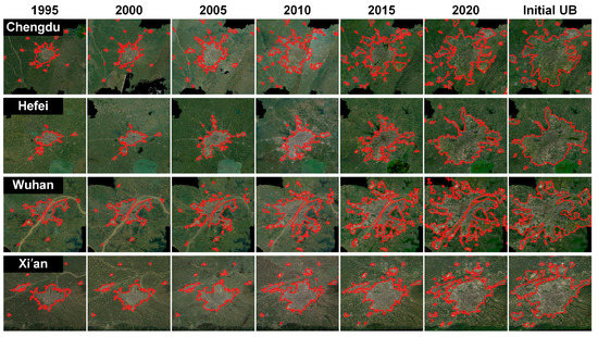 PUBs at multiple periods and the initial urban boundaries of Chengdu (Sichuan Province), Hefei (Anhui Province), Wuhan (Hubei Province), and Xi’an (Shaanxi Province) (Red region means the urban extent. Basemap: Landsat; the natural color band combination strategy. Initial UB means the initial urban boundary).