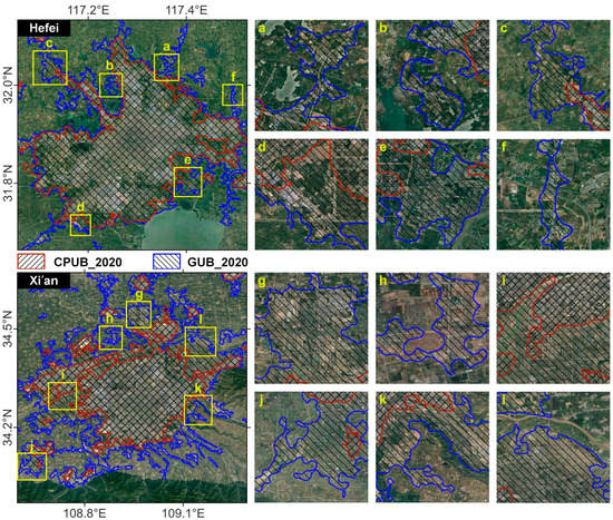 Figure 5 shows the PUBs of Hefei and Xi’an. For the overall of the two cities, the GUB in 2020 is larger than CPUB in 2020, indicating that the GUB may slightly overestimate the boundaries. To this end, we randomly selected six parts at the edges of the two cities to display their details. In the six local enlarged maps of Hefei, the area included in the GUB but not in CPUB contains some agricultural land and few buildings. These six areas are far away from the main body of the city and should be defined as rural areas. Therefore, CPUB can accurately distinguish between urban and non-urban areas. Similarly, in the six local enlarged maps of Xi’an, except for Xi’an(g) (Figure 5g), other submaps are dominated by agricultural land. For Xi’an(g) (Figure 5g), the area is a cluster of villages and contains a large amount of cropland, so it is considered rural.