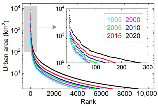 We rank the cities for analyzing urban development from 1995 to 2020 (Figure 6). In 1995, the number of cities in China is 4077; by 2020, the number of cities has increased to 9164, which is 2.2 times that of 1995. For the large cities (an area greater than 100 km2), there are 72 in 1995; by 2020, the number of large cities has increased to 269, which is 3.7 times that of 1995. Moreover, with the acceleration of China’s urbanization process, the difference in China’s urban areas is increasing, and the number of non-large cities is increasing, which shows that Chinese cities are actively developing overall. Furthermore, the city rank of the GUB statistics (Figure S8) is basically consistent with our results.