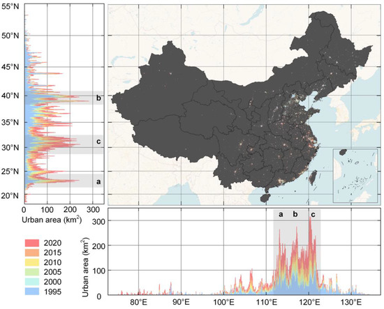 We counted the overall urban area of China in the longitude and latitude directions (Figure 8). For the statistical results in the longitude direction, there are three obvious area peaks in the mask, marked a, b, and c, which correspond to GBA, BTH, and YRD, respectively. Moreover, in areas greater than 110°E, the urban area accounts for 89.3% of China’s total urban area in 1995, and this ratio is 86.3% in 2020. For the statistical results in the latitude direction, the three regions also have high peaks, and the peak around 35°N points to CPUA. Similarly, in areas less than 40°N, the urban area accounts for 74.2% of China’s total urban area in 1995, and this ratio is 83.5% in 2020. In general, China’s urban development center has moved westward and southward. China’s urban development has a phenomenon of uncoordinated regional development at the national scale.