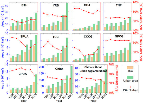 It can be seen in Figure 9 that the urban areas of all regions are growing, among which YRD, TCC, and CPUA have seen rapid urban area growth since 2010, while the TNPs have grown slowly. For the ratio of impervious surface and urban area (urban land intensification), both GBA and GPCG are at a high level of intensification, which may be due to the fact that the plains of Guangdong Province only account for 21.7% of the province’s land area [48], resulting in the forced intensive development of the cities. Likewise, GPCG has a small amount of plain area, which may be one of the reasons contributing to the intensification. Moreover, in 1995 and 2000, urban space has strong aggregation and intensification. With the development of cities, urban sprawl generally occurs in cities with high-speed construction, and some urban agglomerations ignore the intensive construction of cities, such as TCC, CCCG, and CPUA.