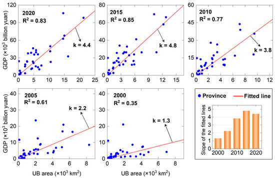 The development of a city is inseparable from the GDP volume of the city, and GDP growth requires the expansion of the city’s size to increase the city’s development potential. Hence, we calculated the relationship between the urban area and GDP in each province (Figure 10). We consider the area of a city to be positively correlated with GDP and assume that the two obey a linear relationship; that is, y = k × x, where x means the urban area, y means the GDP, and k means the slope of the fitted line. In Figure 10, the linear relationship can fit the distribution of the two well with a good fitting effect, except for 2000. In addition, the fitted slope from 2000 to 2015 shows an upward trend, indicating that urban expansion brings more GDP. In 2015, the conversion ratio of the urban area to GDP reaches its peak (4.8). However, from 2015 to 2020, the economic conversion ratio generated by urban expansion has slightly decreased, but it still has a good performance. In general, cities need to be developed more intensively to maximize the economic conversion ratio. Similarly, we show the relationship between the urban area and GDP at the city level (Figure S11), and the results are basically consistent with those at the province level.