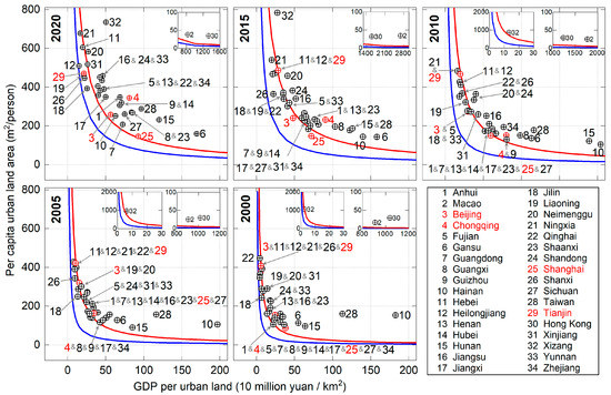 Figure 11 shows the distribution of urban intensification indicators in each province of China. From 2000 to 2020, most of the provinces show an increasing trend in the GDP per urban land and the per capita urban land, indicating that the aggregation of urban population and urban economic potential are both well-represented. We have marked in red four Chinese municipalities: Beijing (3), Chongqing (4), Shanghai (25), and Tianjin (29).