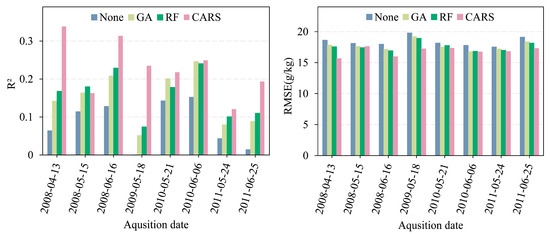 Although the variable selection algorithms improved the retrieval accuracy of SOM, the retrieval accuracies (Figure 2) of different images showed substantial differences. For example, when using CARS, the retrieval accuracy of the image acquired on 24 May 2011 was not as high as that of the image acquired on 13 April 2008, with R2 and RMSE values of 0.12 and 16.80 g/kg, respectively. This indicates that using a single-date image may result in an inaccurate SOM retrieval model, potentially due to the effects of soil moisture or surface cover.