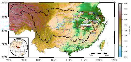 The data used in this paper are available as follows: the GRACE/GRACE-FO are published by the Center for Space Research (CSR, http://www2.csr.utexas.edu/grace/RL06_mascons.html, accessed on 2 June 2023), the CLDAS-V2.0 and CGDPA data are provided by the China Meteorological Administration (CMA, https://data.cma.cn/, accessed on 2 June 2023), the GNSS data can be downloaded from the China Earthquake Data Center (CEDC, https://www.eqdsc.com, accessed on 2 June 2023), the geophysical fluid loading products can be downloaded from the Earth System Modeling group at Deutsches GeoForschungsZentrum (ESMGFZ, http://esmdata.gfz-potsdam.de:8080/repository, accessed on 2 June 2023), and the in situ streamflow data were collected from the Information Center, Ministry of Water Resources, China (http://xxfb.mwr.cn/sq_djdh.html, accessed on 2 June 2023).