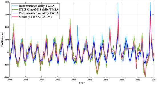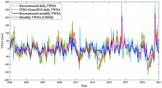 Time series of deseasonalized and detrended reconstructed monthly/daily TWSA, monthly TWSA from CSRM, and daily TWSA from ITSG−Grace2018 solutions in the study area from 2003 to 2020.