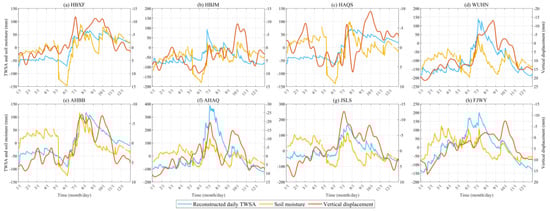 Comparison of reconstructed daily TWSA, soil moisture, and the vertical displacement of eight GNSS stations during 2020. It should be noted that the axis of vertical displacements from GNSS are inverted for comparison.