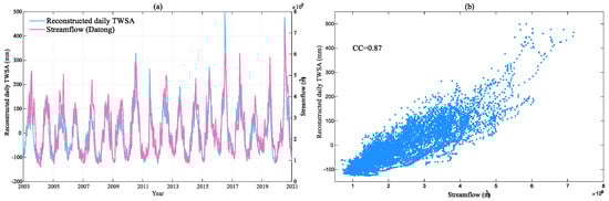(a) Time series of reconstructed daily TWSA in the sub−study area and daily streamflow from Datong station from 2003 to 2020; (b) scatter graph. The X-axis represents streamflow, and the Y-axis represents TWSA.