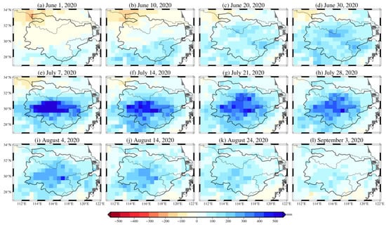 The spatial distribution of reconstructed daily TWSA in the study area from June to August 2020 is displayed in Figure 5. As observed from the figure, most of the grids in the study area exhibit negative TWS anomalies on 1 June, indicating that the region is relatively dry. With the onset of the plum rains, the TWSAs start to increase rapidly. Some grids in the southern part of the study area begin to show positive TWS anomalies in early to mid-June. By the end of June, almost all the grids in the study area display positive TWS anomalies. Throughout July, the TWS of the grids in the study area continues to show significant positive anomalies, particularly in the middle part. By early August, the range of TWSA exceeding 200 mm in the middle of the study area decreases, and the anomalies finally subside after September. The spatial variations of monthly TWSA from CSRM (Figure 6) are similar to those of reconstructed daily TWSA. However, reconstructed daily TWSA captures the spatial variation in TWS at a daily scale, while monthly TWSA from CSRM reflects the variation at a monthly scale. The finer temporal resolution of the reconstructed TWSA provides more detailed information on the spatial evolution of floods, which in turn facilitates disaster prevention, mitigation, and post-disaster management.