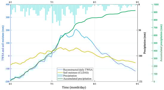 The average TWSA in the study area peaked at 206.34 mm on July 19 (Figure 7). From 1 June to 19 July TWSA increased by 407.57 mm (146.73 km3). After reaching the peak, the average TWSA of the study area showed a downward trend and decreased to −118.67 mm on 31 August (Figure 7). Although the variations in soil moisture are strongly correlated with the variations in reconstructed TWSA, their magnitudes differ considerably. Such a significant difference between soil moisture and reconstructed daily TWSA during the peak may be attributed to the limited soil water storage capacity. At this time, the soil water storage in the study area is saturated and can no longer increase. In addition, TWS consists of groundwater, surface water, soil moisture, and snow [,,]. Variations in soil moisture storage account for only a tiny proportion of the variations in TWS in many areas. The variations in groundwater and surface water storage are usually much greater than variations in soil moisture storage []. Moreover, the uncertainty of soil moisture simulated by CLDAS, and the limitations of the statistical reconstruction method are among the reasons. Therefore, the difference between TWSA and soil moisture is considered reasonable. From 1 June to early July, the TWSA is consistent with accumulated precipitation. This is probably because most of the accumulated precipitation in the earlier period serves to increase water storage, but the storage capacity of a region is limited, and water storage does not increase beyond a certain point.