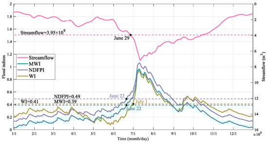 The storage capacity of a region is limited, and continuous heavy precipitation can saturate regional aquifers. At this point, additional precipitation will increase streamflow if it continues []. Although high discharge does not necessarily lead to flooding, it indicates a high risk of flooding. Many studies have used discharge to identify flood levels [,,]. In this study, we use the in situ daily streamflow from Datong station for the 90th percentile flood to evaluate the early warning capability of MWI and NDFPI for the flood event in the YRB in 2020.