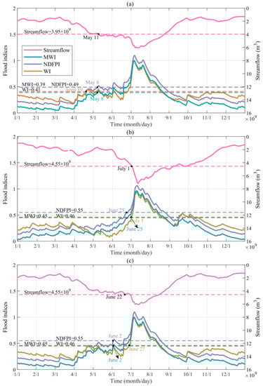 Comparison of NDFPI, WI, and MWI (NDFPI moves up by 0.1 for a better view) of the sub-study area and daily streamflow at Datong station in (a) 2016 for the 90th percentile floods, (b) 2020 for the 95th percentile floods, and (c) 2016 for the 95th percentile floods.