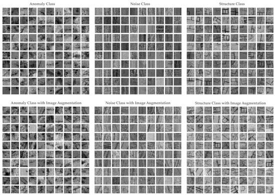 In supervised learning, a well-defined annotated dataset is crucial to efficiently train models that can classify or predict new unseen data [16]. Such a dataset for detecting ancient buried structures in GPR data is currently missing or is not publicly available. This constraint has led to a limited exploration and utilization of CNNs in the field of GPR for archaeological purposes. For this reason, a training dataset was made from scratch to perform image classification. This dataset underwent initial testing in our previous studies [4,15]. To better describe the complexity of the GPR C-scans that are collected from archaeological surveys, three classes were defined that, from experience, are being used the most when interpreting such data: