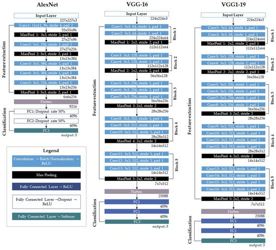 VGG-16 and VGG-19 were introduced in [22] as very deep CNN architectures and were developed by the Visual Geometry Group (VGG) at the University of Oxford. The input of both architectures is a color image of 224 × 224 × 3, and while they have similar structures, they differ in the number of layers, with VGG-19 being deeper.