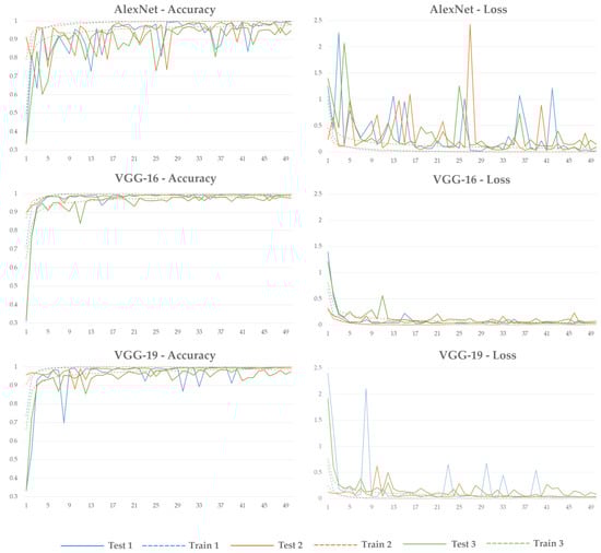 To compare the generalization, the models’ sets of weights exhibiting the lowest validation loss were chosen from the learning curves presented in Figure 3. Specifically, AlexNet-1 was epoch 29, AlexNet-2 was epoch 36, AlexNet-3 was epoch 31, VGG16-1 was epoch 44, VGG16-2 was epoch 27, VGG16-3 was epoch 35, VGG19-1 was epoch 32, VGG19-2 was epoch 38, and, lastly, VGG19-3 was epoch 40. These models were used to make predictions on the 170 unseen samples of the evaluation set. The confusion matrices and classification accuracy are presented in Figure 4. Overall, the resulting models perform well, with the VGG19 architecture models exhibiting the highest and lowest accuracies. More specifically, VGG19-2 has the highest accuracy of 94.12%, while VGG19-1 and VGG19-3 have the lowest of 87.65%.