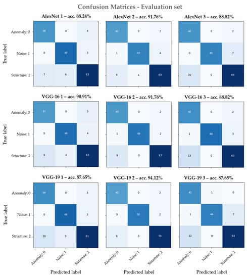 The diagonal elements of the matrices represent the TPs for each class, while the rest are the misclassified elements. For the Anomaly class, VGG19-3, despite the lower classification accuracy, has the most TPs. It correctly predicted 41 out of 42 samples, while 1 sample was wrongly classified as Noise. The next best models for the Anomaly class are VGG19-2, VGG16-2, and AlexNet-2, counting 40 TPs. For all three models, the 2 samples are misclassified as a Structure. The model with the fewer TPs is VGG16-1, having predicted 37 out of 42 samples correctly, while the rest are misclassified as a Structure.