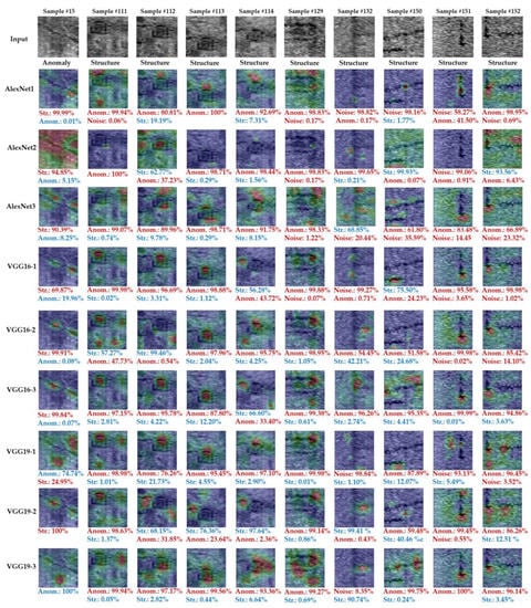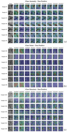 For the Noise class (Figure 5b), the selected samples are weak striping noise in the background (sample no. 44) and linear noise in different amplitude intensities caused by background removal (samples no. 47, no. 52, no. 61, no. 69, and no. 88). Lastly, sample no. 68 is horizontal linear noise caused by plowing lines. Aside from sample no. 47, no. 52, and no. 61, where most models describe the target noise well, the rest of the heatmaps show variations in the areas upon which the predictions were made. The horizontal noise in sample no. 68 is best described by AlexNet-1 and VGG16-3, while the rest of the VGG models are affected by more extensive areas of the image. Similar behavior is presented for the vertical noise of sample no. 69, with AlexNet-1 having the best correlation. As for the attenuated noise in sample no. 44 and no. 88, AlexNet models were affected almost by the whole image, while VGG models were affected by image segments of different shapes and sizes. In addition, some of the models were affected by points in the image, such as the cases of VGG19-1 and VGG19-2 for input sample no. 88, which have no correlation with the target. Lastly, AlexNet3 has produced zero heatmaps for sample no. 47, no. 52, no. 61, no. 68, no. 69, and no. 88, showing no correlation to the targets but having made a correct prediction.