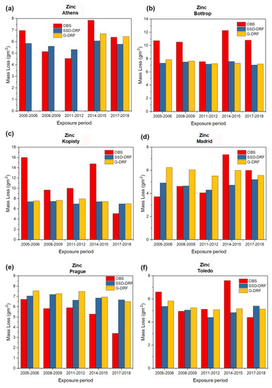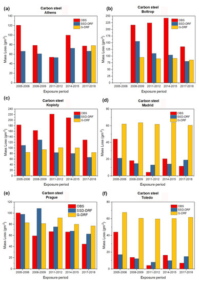 The experimentally observed mass loss of carbon steel (red bars), the estimated mass loss of carbon steel using SSD-DRF (blue bars) and the estimated mass loss of carbon steel using G-DRF (yellow bars) for case (a) Athens, (b) Bottrop, (c) Kopisty, (d) Madrid, (e) Prague and (f) Toledo after five different one-year exposure periods (2005–2006, 2008–2009, 2011–2012, 2014–2015, 2017–2018). The missing yellow bars in the case of Athens are due to the lack of the necessary ground-based data necessary for the application of G-DRF.