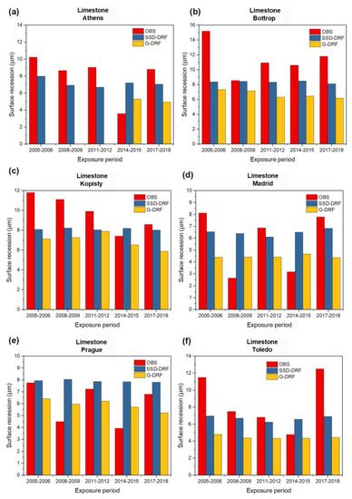 As in Figure 2, but for the case of Limestone. (a) Athens, (b) Bottrop, (c) Kopisty, (d) Madrid, (e) Prague and (f) Toledo.