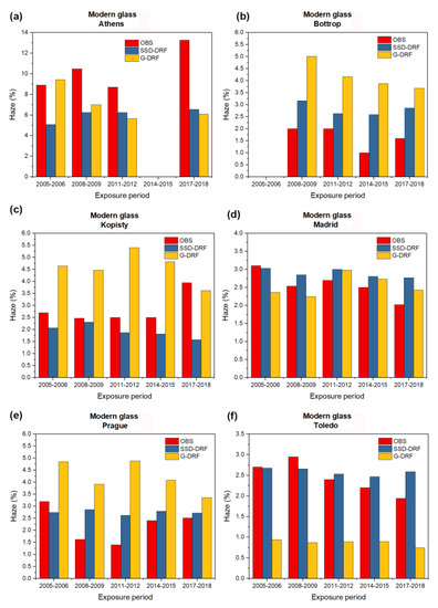 As in Figure 2, but for the case of modern glass haze. (a) Athens, (b) Bottrop, (c) Kopisty, (d) Madrid, (e) Prague and (f) Toledo. The gaps at Athens and Bottrop at the exposure periods of 2005–2006 and 2008–2009, respectively, are due to a lack of experimental data.