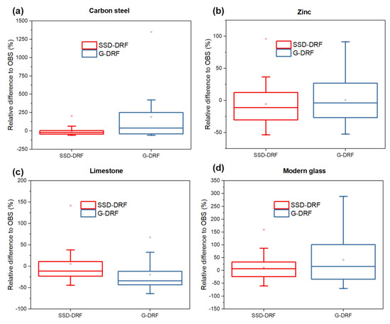 The relative differences between corrosion/soiling estimates calculated using SSD-DRFs and G-DRFs and experimentally obtained data for the case of (a) carbon steel mass loss, (b) zinc mass loss, (c) limestone recession and (d) modern glass haze.