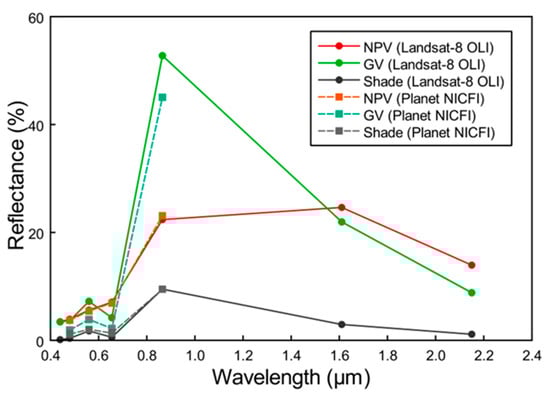 Spectral reflectance of Landsat-8 OLI and PlanetScope NICFI endmembers.
