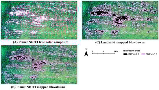 Examples of PlanetScope NICFI basemap (A), blowdown mapping considering a ΔNPV threshold greater than 0.3 for PlanetScope NICFI (B), and Landsat-8 (C). The longitude and latitude of this blowdown are 63.75°W, 2.31°S; image data: October 2020.